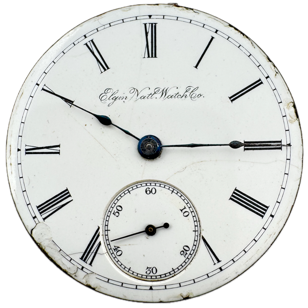 Antique 18 Size Elgin 5 7 Jewel Mechanical Pocket Watch Movement 73 USA Product Description Item: Pocket Watch Movement Brand: Elgin Model: 5 Movement: Mechanical Production Year: 1891 Country: USA Jewels: 7 Jewel Gender: Men's Grade: 73 Size: 18 Size Product Measurements Diameter: 46mm Product Condition Overall Condition: Poor, overall condition for its age. Functions: Not running, the Balance staff is broken. Dial: The dial has hairline crack(s) on it