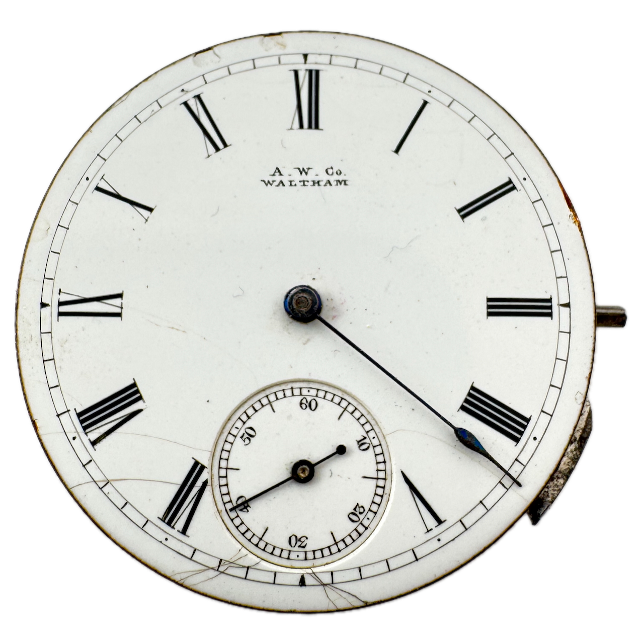Antique 8s 1883 Waltham 7 Jewel Hunter Pocket Watch Movement Wm. Ellery USA Product Description Item: Pocket Watch Movement Brand: Waltham Movement: Mechanical Production Year: 1883 Country: USA Jewels: 7 Jewel Gender: Men's Grade: Wm. Ellery Size: 8s Product Measurements Diameter: 36mm Product Condition Overall Condition: Fair, overall condition for its age. Functions: Not running but the balance complete is in good condition. Dial: The dial has hairline crack(s) on it. Hands: It is missing the hour hand. There is discoloration on the hands.