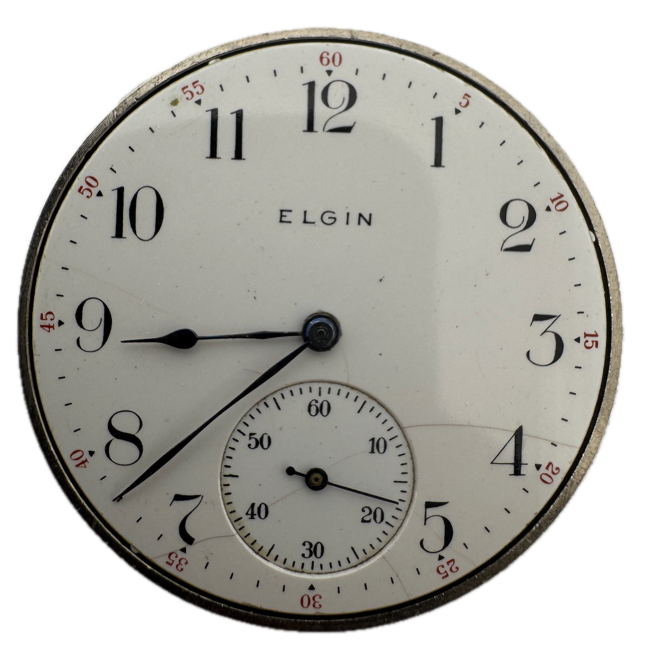 Antique 12s 1908 Elgin 7 Jewel Mechanical Hunter Pocket Watch Movement 301 Product Description Item: Pocket Watch Movement Brand: Elgin Movement: Mechanical Production Year: 1908 Country: USA Jewels: 7 Jewel Gender: Men's Grade: 301 Size: 12s Product Measurements Diameter: 40mm Product Condition Overall Condition: Fair, overall condition for its age. Functions: Not running but the balance complete is in good condition. Dial: The dial has hairline crack(s) on it. Hands: The hands have rust on them.