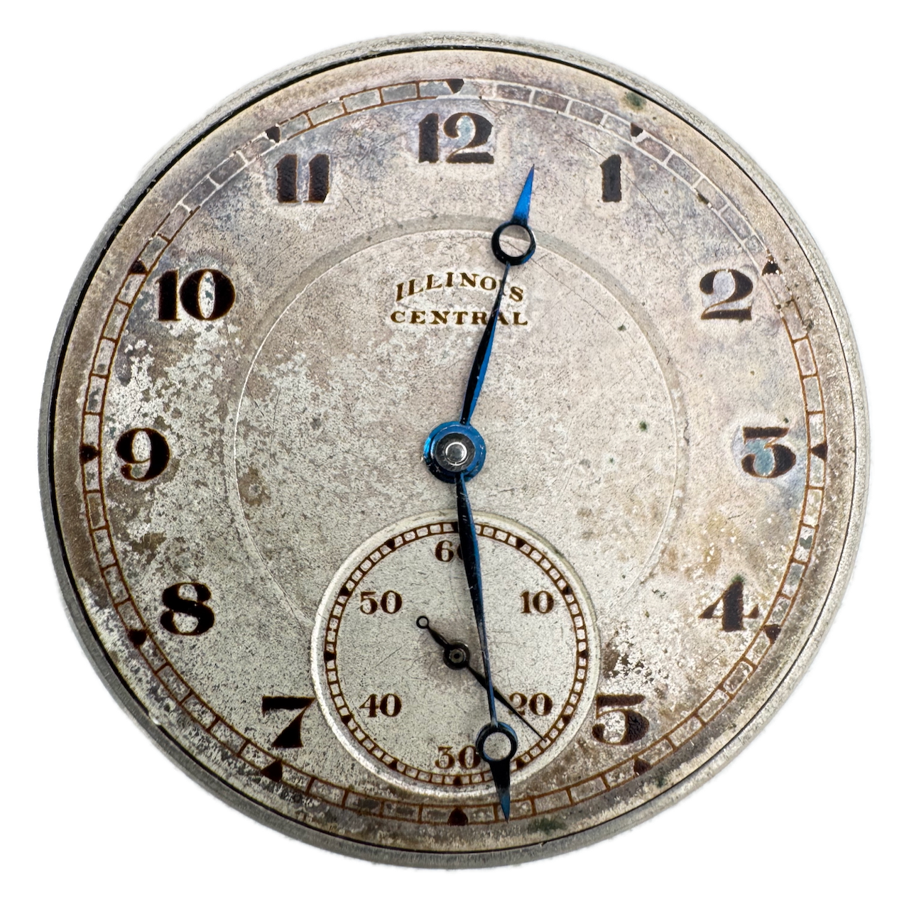 Antique 12s 1916 Illinois Central Two Tone 17 Jewel Pocket Watch Movement 404 Product Description Item: Pocket Watch Movement Brand: Illinois Model: Central Two Tone Production Year: 1916 Jewels: 17 Jewel Gender: Men's Grade: 404 Size: 12s Product Measurements Diameter: 39.5mm Product Condition Overall Condition: Fair, overall condition for its age. Functions: Not running but the balance complete is in good condition. Dial: The dial has discoloration and spotting.