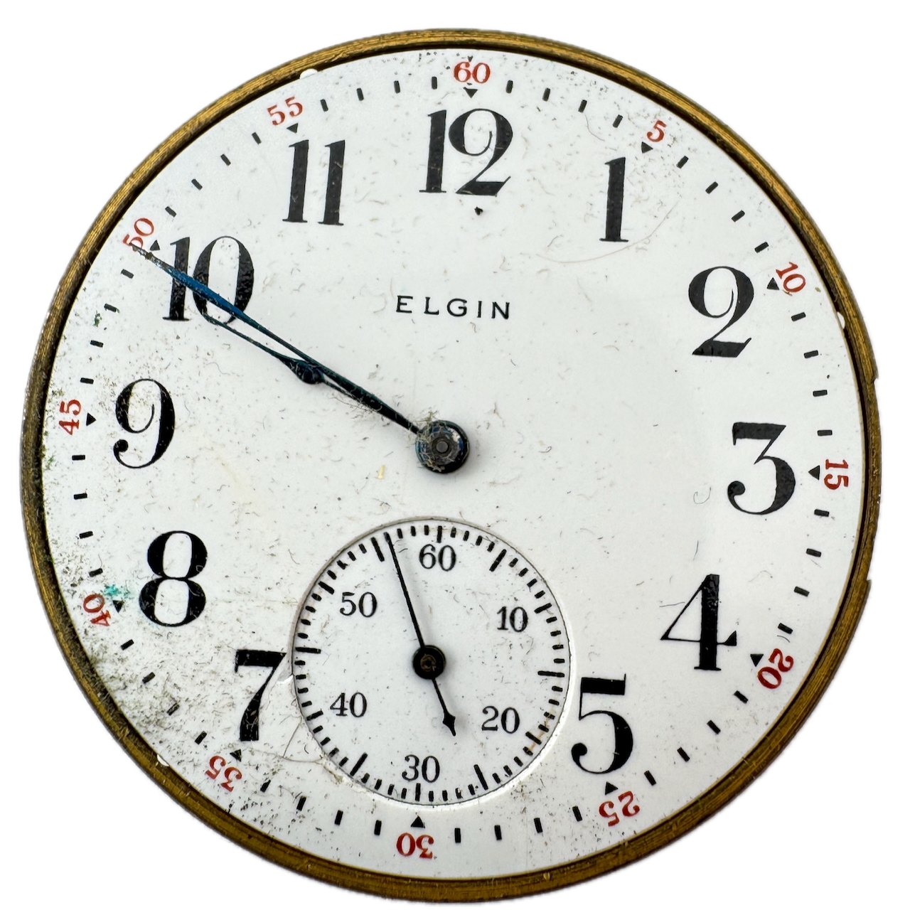 Antique 12s 1917 Elgin 7 Jewel Mechanical Hunter Pocket Watch Movement 310 USA Product Description Item: Pocket Watch Movement Brand: Elgin Movement: Mechanical Production Year: 1917 Country: USA Jewels: 7 Jewel Gender: Men's Grade: 310 Size: 12s Product Measurements Diameter: 39.5mm Product Condition Overall Condition: Fair, overall condition for its age. Functions: Running, but may be in need of service. This means, it can run unreliably, start or stop and timekeeping is not guaranteed. Dial: The dial has chips on it.
