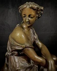 The Antique Late 19th Century ( Circa.1870s ) French Painted Bronze Figure "Femme à l'antique" By Artist Duchoiselle ( French, 19th C. ), Signature in the Left Lower Front Side. This Beautiful Painted Cast Bronze Figure Represents An Ancient Elegant Woman Wearing A Floral Headdress and A Classical Long Dress Sitting Gracefully, Holding A Flower in One Hand and A Scroll in the Other, Look Peacefully at the Side with A Thoughtful Expression. The Proportions of the Figure are Precise, the Figure's Expressions are Vivid and Lifelike, and the Hair, Clothing Folds and Other Details are Delicate and Exquisite. Some Wear on it Consistent with Age, In Good Condition. Title: "Femme à l'antique" Artist: Duchoiselle ( French, 19th C. ) Time Period: 1870s Medium: Bronze Condition: Good Condition Size: 9-1/2" H, 9" L, 5" W Weight: 7lbs. 15oz Available For Domestic Shipping and International Shipping. Thanks!