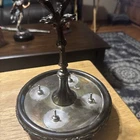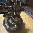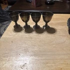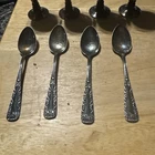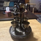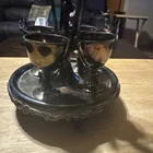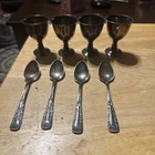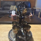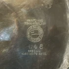 This antique egg cup set features four silver cups made of 046 Special White Metal, accompanied by matching spoons and a stand from the Standard Silver Company LTD in Toronto. The set includes four compartments for the cups, all sitting on a single-tiered stand. This vintage piece showcases a metallic finish and is an original creation from Canada. Perfect for serving eggs in a stylish and elegant manner, this set exudes a sense of old-world charm and sophistication.