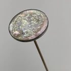 Antique hat pin with flat disc pinhead made of abalone or other mother-of-pearl-like shell set in a silver-tone metal (possibly silver, not marked). Pin is a little over 10 inches long. In very good condition -- see pictures. Will ship USPS, well packed, within 2 days. See my eBay store for lots more interesting vintage items. I offer discounts for combined shipping. Thanks for looking!