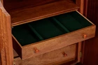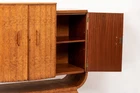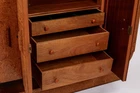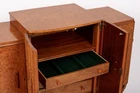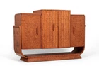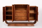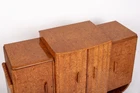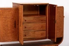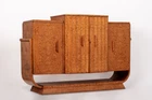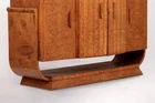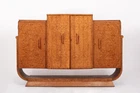 This exceptional English Art Deco elm wood bar cabinet or sideboard is circa 1930. The cabinet is expertly handcrafted and features stunning Carpathian elm wood grain with a “skyscraper” breakfront design with a taller central section and two lower side sections floating over a u-shaped base. The center section features double rounded and fluted doors opening on open top storage over three drawers with hand-dovetail joint construction and original Bakelite floral drawer pulls. The top drawer has original felt lining. Two flanking side doors open on large storage compartments with two removable shelves on the left and one removable shelf on the right. The cabinet has distinctive original sculpted wooden handle pulls and working key is included. This collectible and versatile cabinet can be used as a bar cabinet, sideboard or credenza, storage cabinet, media console, etc. The perfect showpiece for home or office. CONDITION Excellent vintage condition with wear consistent with age and use and an antique appearance. Interior drawers show minor gapping expected with age, but function properly. DIMENSIONS W 63.5" x D 21" x H 42.375" SHIPPING In cases in which free delivery is offered, some exceptions based on item and based on buyer location do apply. Please contact us prior to purchase for details. Free local pickup. Local delivery available for a small fee.