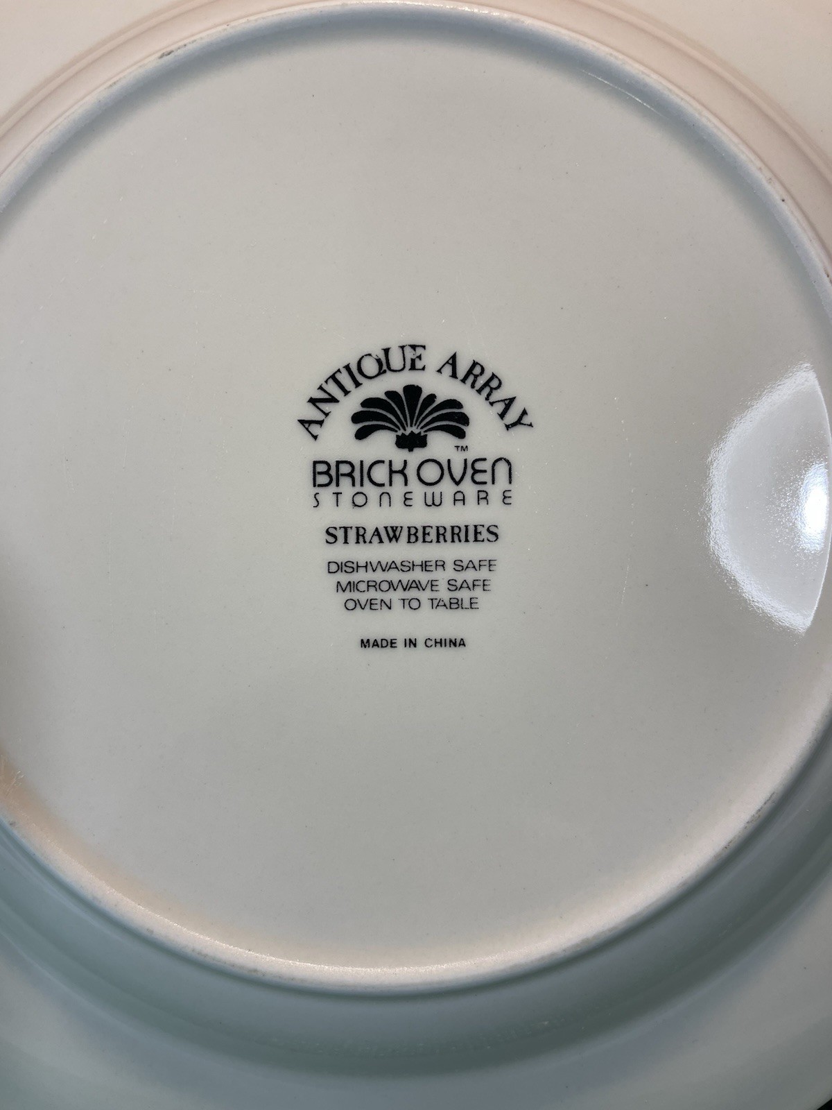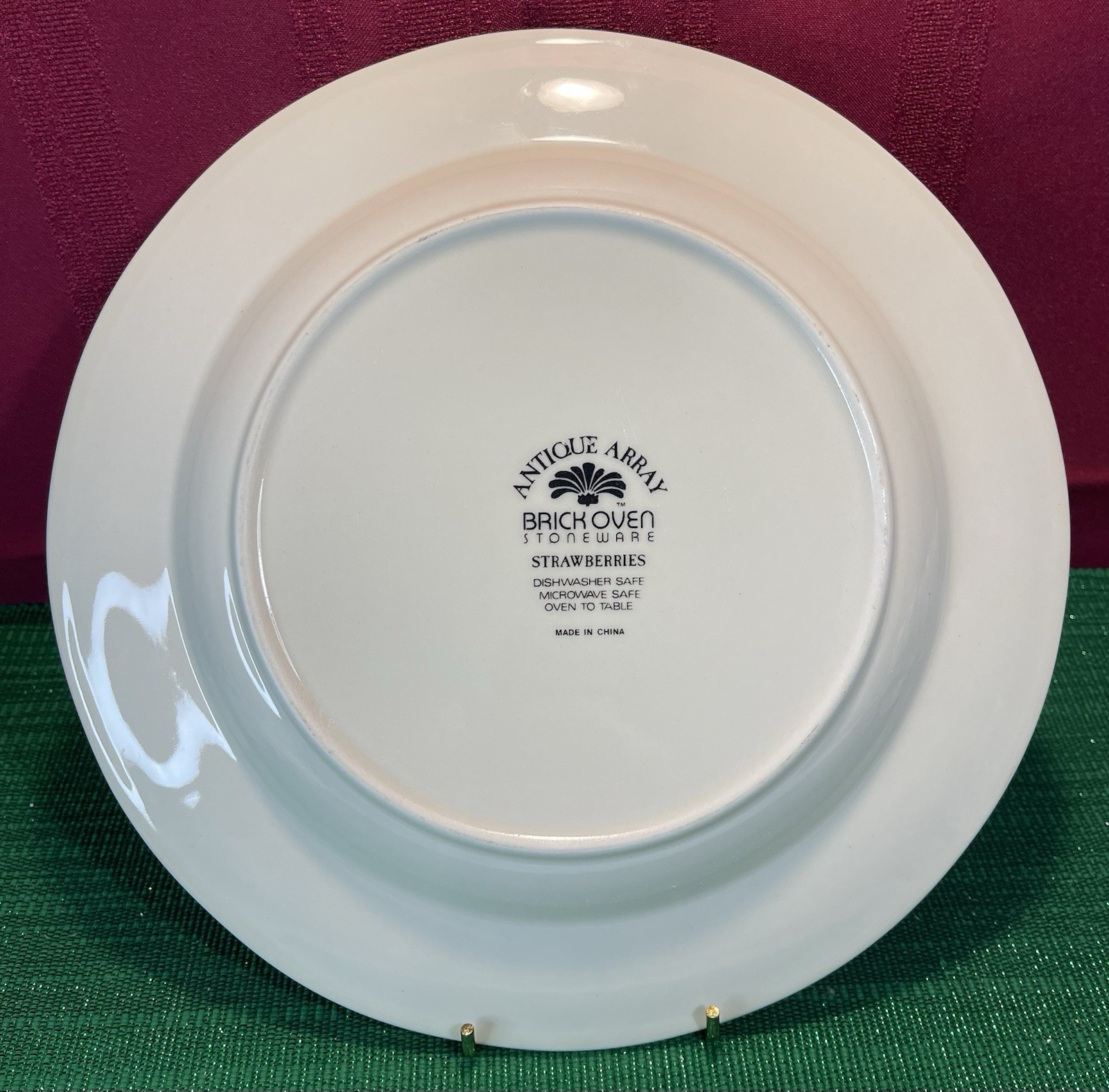 This Antique Array Brick Oven Stoneware Strawberries Plate is a vintage piece from the late 20th century, specifically manufactured in America in 1970. The round plate features a beautiful strawberry pattern in cream color, with a glossy finish. Made of stoneware, it is both microwave and dishwasher safe, perfect for oven-to-table use. This mid-century modern style dinner plate is a unique addition to any table setting, ideal for all occasions. The 10 1/2" plate is a single-piece set that showcases a charming Strawberry theme, making it a delightful centerpiece for any dining experience. Plate stand not included. Please see pictures for the exact item.