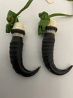 This antique carved figure is a unique addition to any collection. The horn-shaped knitting needle guards are a great accessory for any knitting enthusiast. The hooked horn design adds a touch of vintage charm to your knitting projects. Perfect for those who love to add a personal touch to their crafts. The needle guards are perfect for keeping your knitting needles organized and safe when not in use. I came across these while cleaning out some of my Mom’s things and had no idea what they were. I found similar on eBay so I guess that’s what they are. I have no idea what they are made of. There is a price tag that was on the string $145. View all the photos for they are the description. Pointed out one of the hooks is chipped on the end. Thanks for looking!