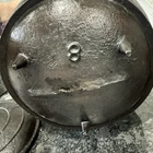 This antique cast iron bean pot is a vintage collectible piece that is perfect for any kitchen or home decor. This round cauldron pot features a classic design with a sturdy handle and a matching lid, making it a functional and stylish addition to any cooking space. Made of cast iron and with a black color, this original piece is compatible with gas stoves and is sure to add a touch of nostalgia to your cooking routine.