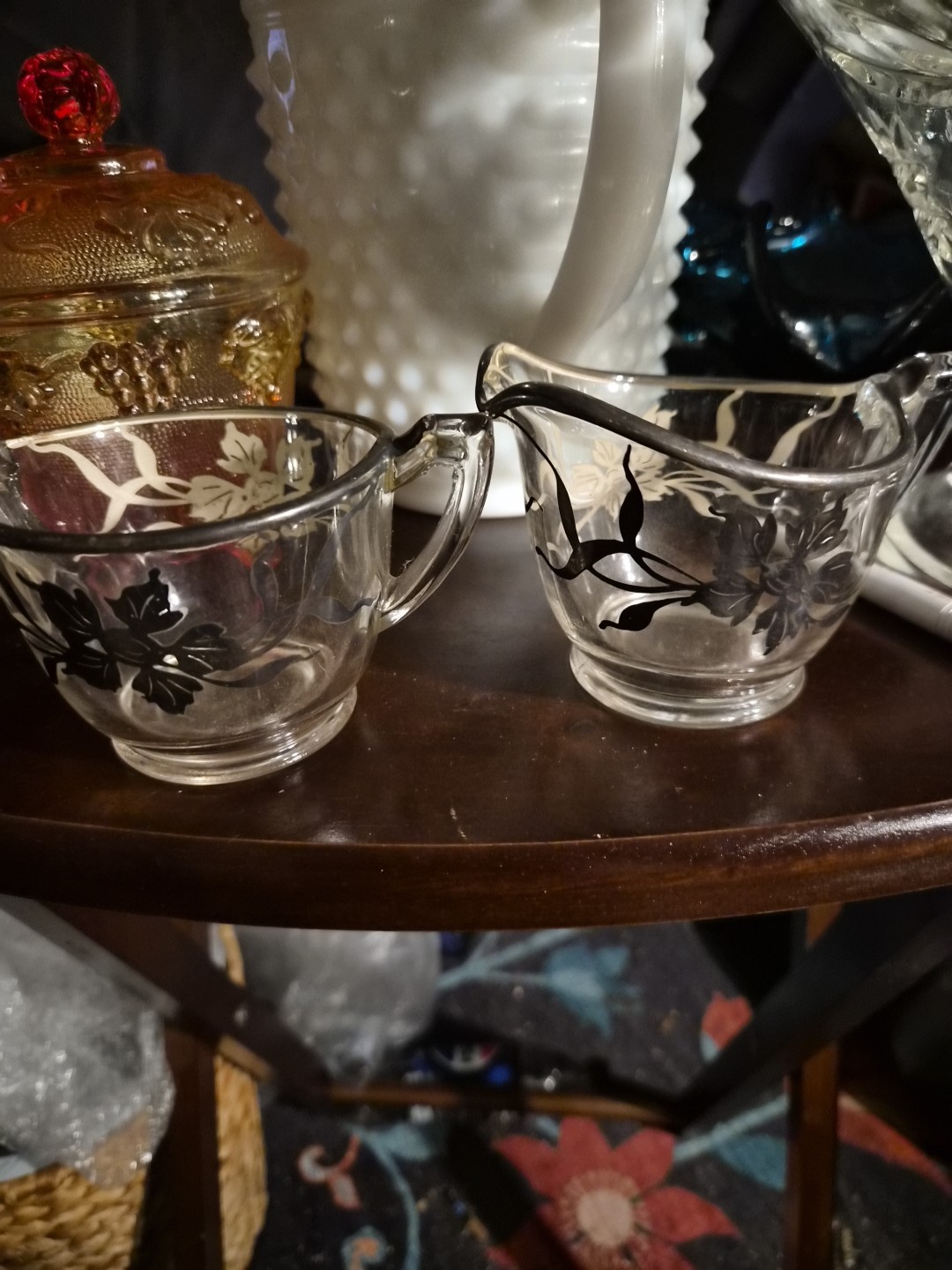 This antique cut glass creamer and sugar set features a beautifully etched design of flowers, accented with sterling silver overlay. The Art Deco style and composition of sterling silver give it an elegant and timeless appeal, perfect for adding a touch of vintage charm to any dining table. Dating back to the early 1900s, this set is a unique and decorative piece for collectors or those looking to enhance their home decor with a touch of antique sophistication.