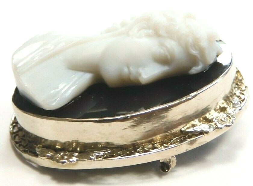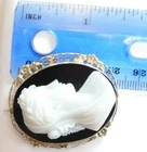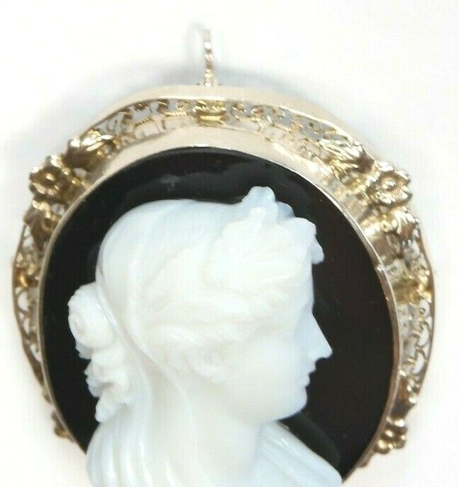 ANTIQUE EDWARDIAN BLACK ONYX HARDSTONE CAMEO PIN PENDANT {International Buyers Are Responsible For Customs & Duty Fees} Circa ~ 1910'S Natural Hard Stone Black Onyx Measurements of Cameo ~ 33,45 MM (1.317 Inches) x 23.80 MM (0.937 Inches) x 14.34 MM (0.5645 Inches) ~ Measurements Of Frame ~ 40.11 MM (1.5795 Inches) x 34.77 MM (1.369 Inches) x 14.34 MM (0.5645 Inches) Metal ~ 13K White Solid Gold Weight ~ 20.4 GramsAuthentic Art Deco Period (Not Art Deco Style Or Inspired) Intricate Handmade Filigree Workmanship By A Master Jeweler Extraordinary Hand Carving (Museum Quality) High Relief Remarkable + Ravishing Excellent Condition Substantial Weight + Size Can Be Worn As A Pin/Brooch Or A Pendant We Will Ship Your Treasure As Soon As PayPal Clears The Payment Free UPS Next Day Air With Insurance (Exception: P.O. Box Address We Will Ship USPS Priority Mail Insured) We Will Include A Leatherette Brooch/Pendant Box For This Special Occasion {Our Policy Is: If you are not 100% happy with your purchase you can return for a full refund of the purchase price within 30 days providing the cameo is not damaged or altered} INTERNATIONAL BUYERS We Accept PayPal As Method Of Payment Buyer Is Responsible For Customs & Duty Fees (Friends from Australia, We will provide a Australia - United States Free Trade Agreement Document that will eliminate any customs fees you may be charged) We Will Not Mark Jewelry As "GIFTS" Or Undervalue the Price You Paid We Welcome Your Questions And Comments (We are happy to provide additional pictures if requested) "Bill Me Later" 6 Months Interest Free And You Will Receive The Brooch/Pendant Immediately { Please Contact PayPal For Details} An Educated Consumer Is Our Best Customer Jewelry...the gift that lasts forever {Please Note: UPS will deliver to the address you have registered with PayPal. To avoid any inconvenience, I recommend adding a work or an alternate address to receive the package}