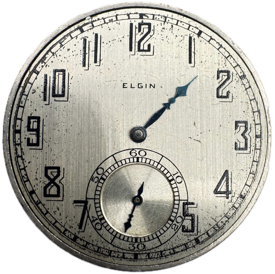 Antique 12 Size Elgin Mechanical Pocket Watch Movement Grade 301 for Repair Product Description Item: Pocket Watch Movement Brand: Elgin Movement: Mechanical Jewels: 7 Jewel Gender: Men's Grade: Grade 301 Size: 12 Size Product Measurements Diameter: 39.5mm Product Condition Overall Condition: Fair, overall condition for its age. Functions: Running intermittently, will need service. Dial: The dial has scratches and discoloration. Hands: There is discoloration on the hands.
