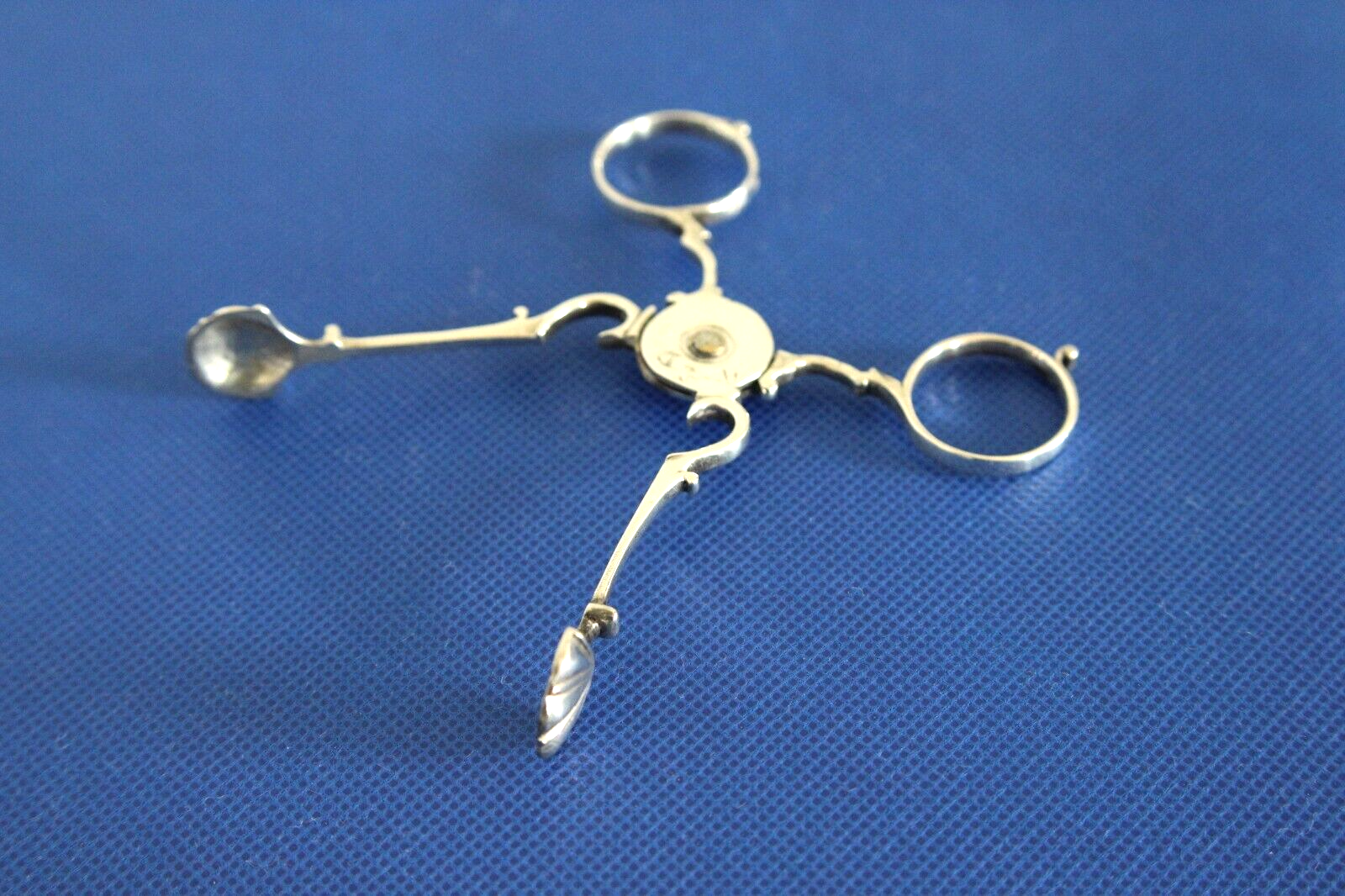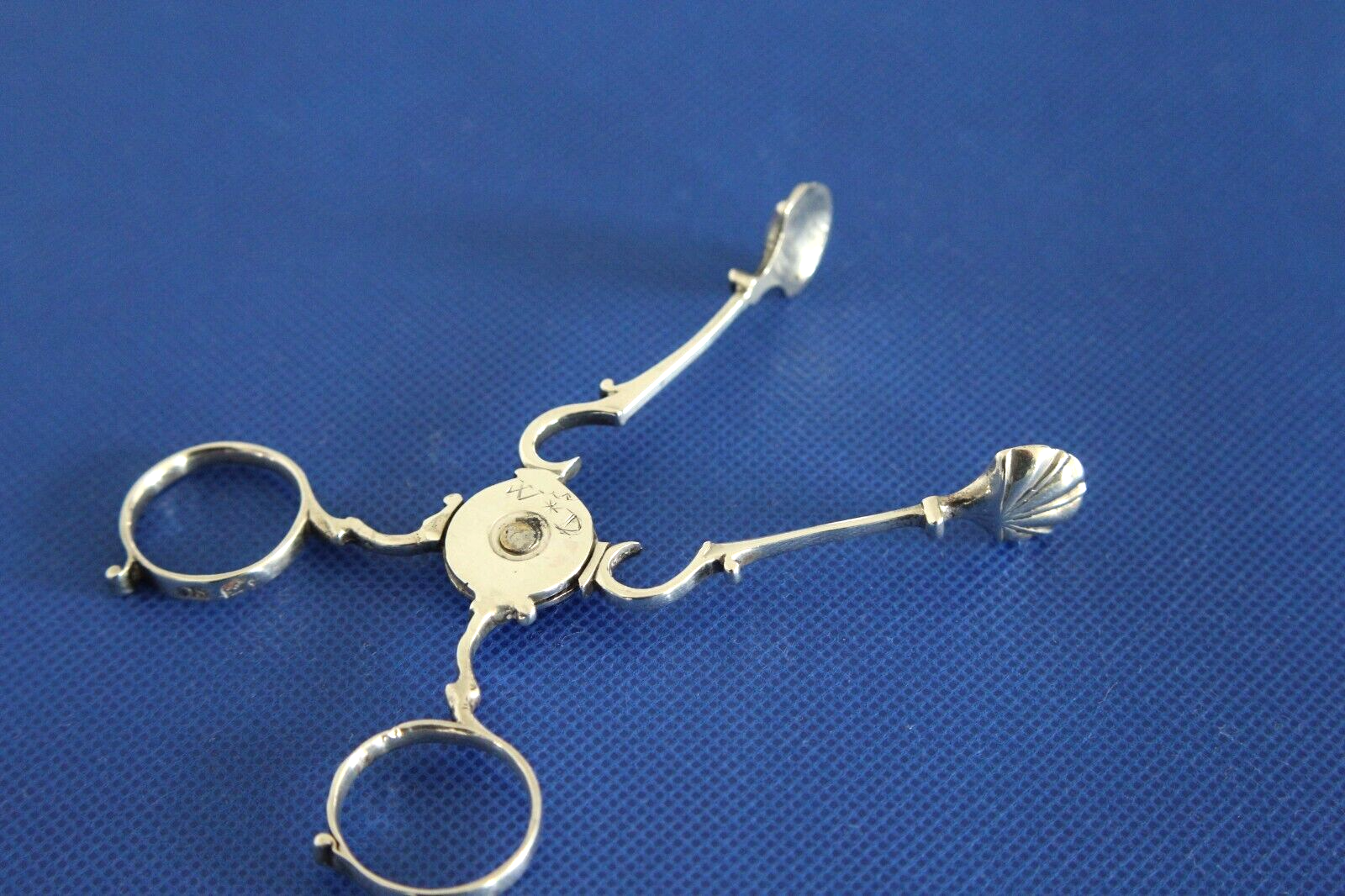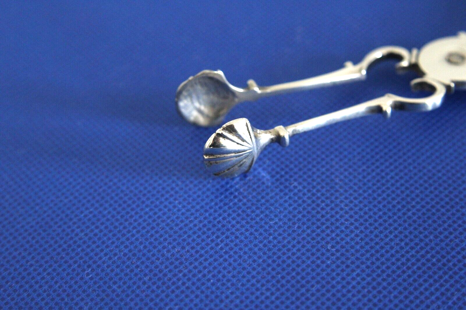 Antique Georgian Solid Sterling Silver Sugar Nips c 1763 in rather nice condition. A fine early pair of English Antique silver sugar nips by hallmarked in London by silversmith Simeon Coley (1762-1763). Beautiful quality , nice design with silver ring handles , ornate scrolled arms and attractive cast shell bowls , Decorated with an historic engraved set of "marriage" initials , Great pair. Stamped on both ring handles with early Lion passant / Sterling silver hallmarks with the silversmith's initials Simeon Coley. Good overall condition considering they are approx 260 years old ! , no splits , or polish holes. Still have a secure scissor action. Weight : Approx 29 g. Approx dimensions : 115mm x 48 mm max width. Reference : 2037