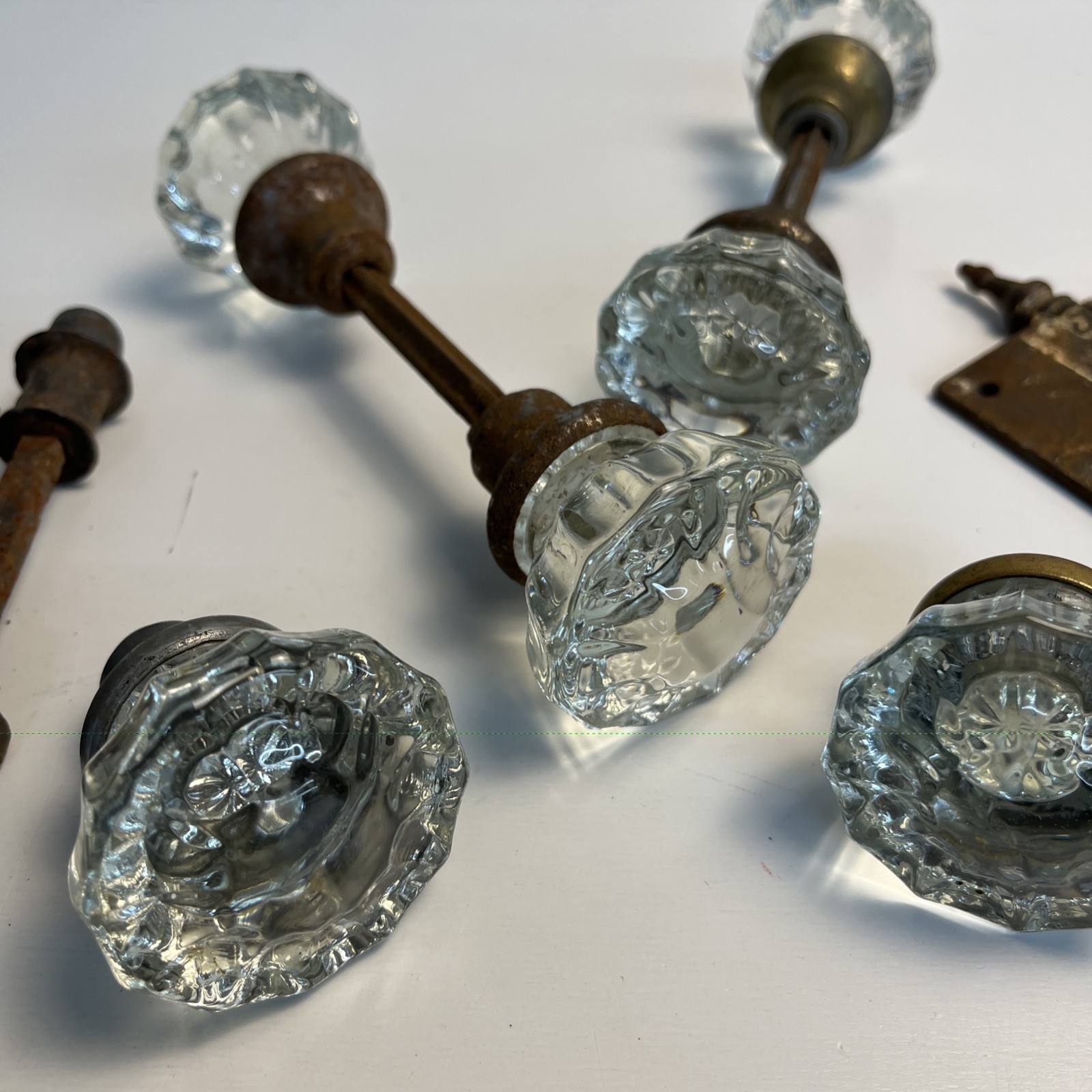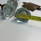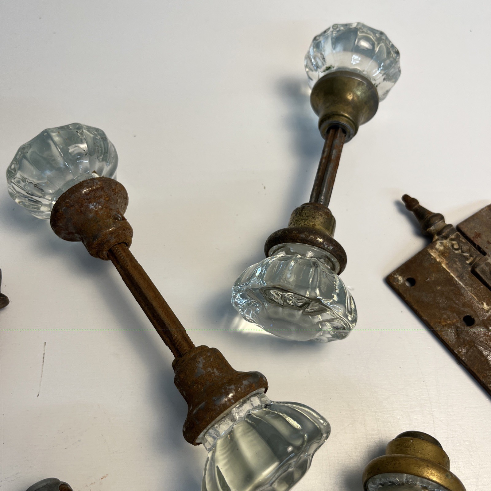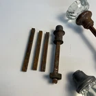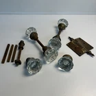Lot of antique glass doorknobs and hardware. Included are six antique glass knobs in mixed pairs along with an authentic Victorian hinge and several miscellaneous hardware pieces and spindles. The knobs and metal parts show age related wear rust and patina consistent with true antique architectural hardware. Ideal for restoration projects repurposing or use in farmhouse or Victorian homes. ⸻ Condition Preowned antique condition with rust wear and patina. Glass knobs intact.