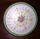 This is a antique victorian pin. It is all sterling silver and gold plated with a engine turned enamel front. The center is a pink rose. It is marked "STERLING 2" on the back of it. It is in good condition with some wear and tarnish. The gold plating has some fading. The enamel is in really good condition. Length- 1.5 inches Width- 1.5 inches Weight- 19 grams