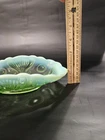 No chips or cracks. Great condition The Antique Green Opalescent Glass Bowl Jewel and Fan by Jefferson Glass Co is a vintage decorative dish in an oval shape. Featuring a beautiful green opalescent color with a flower theme and art deco style, this bowl is perfect for all occasions. Made from glass using fused glass production technique, this original antique piece exudes elegance and charm. Ideal for collectors or those looking to add a touch of vintage flair to their home decor, this bowl is a unique and stylish addition to any collection.