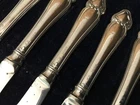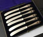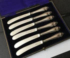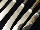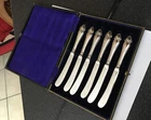 ANTIQUE VINTAGE HM HALLMARKED HM SILVER DINNER DESSERT BUTTER KNIVES BOXED SET - CUTLERY The box appears to be original to the knives Hallmarked Silver Handles bear marks for Sheffield - date letter M (1914) and maker FC - Probably Frank Cobb Blades are silver plated EPNS with hallmarked silver handles Measures 16.5cm long Very Good vintage pre-owned condition. Box in good condition - a few marks on exterior