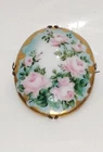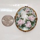 This is an incredibly beautiful Victorian hand painted floral porcelain brooch. Hand painted delicate pink roses with green foliage and a hint of blue sky. Very talented artist. The painted porcelain was claw set onto brass. The back of the pin shows the old style C clasp and long pin stick mechanism. There is also a special engraving on the back shown in pictures. Probably made around 1900, this piece is in very good vintage condition. The paint is in wonderful shape with hardly a trace of wear other than the outer edges. The pin stick wiggles but stays nicely in the C clasp, due to just-the-right-size opening. Please see pictures for description and condition. One of the left side double claws is missing. This brooch measures 1 3/4 inches wide and 2 1/8 inches long. Also pictured is a quarter for size reference. Please message me if you have any questions and happy shopping. 🩷💚