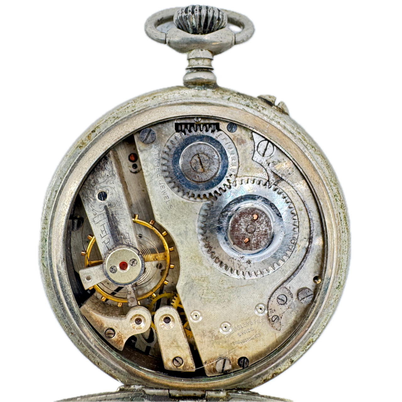 Antique Hasler Triple Date Moonphase Mechanical Pocket Watch Nickel Swiss Product Description Item: Pocket Watch Brand: Hasler Model: Triple Date Moonphase Movement: Mechanical Case Material: Nickel Country: Swiss Gender: Unisex Product Measurements Diameter: 53mm Product Condition Overall Condition: Poor, overall condition for its age. Functions: Not running, the Balance staff is broken. Case: There are scratches on the case. Crystal: There are scratches on the crystal. Dial: The dial has discoloration and spotting. Hands: It is missing the second hand. The hands have rust on them. Additional Information: It is missing the pin set.