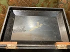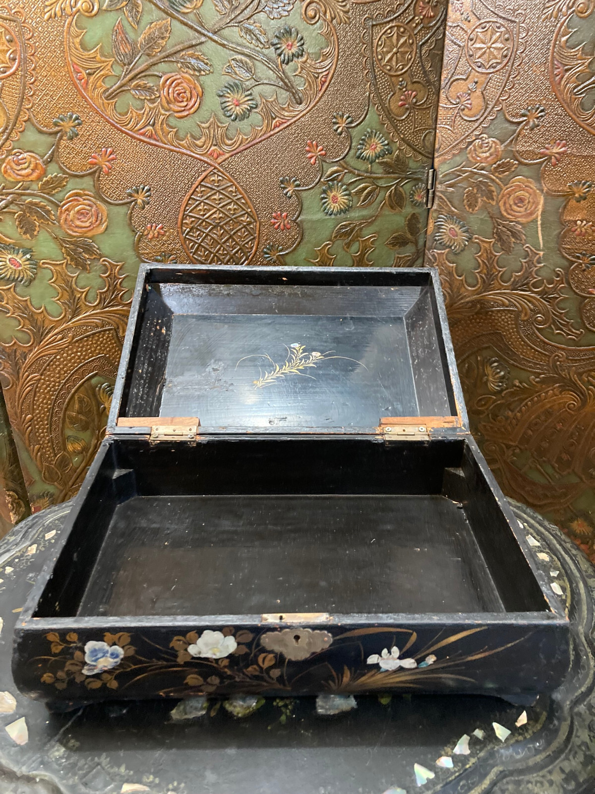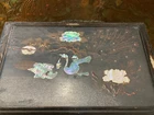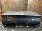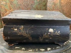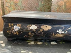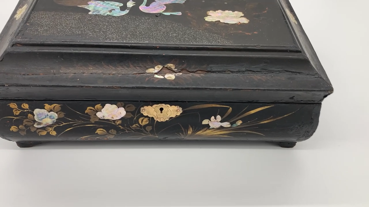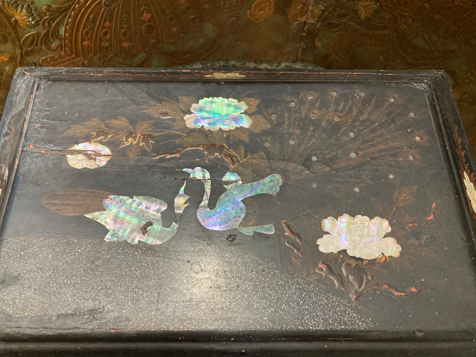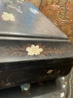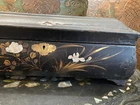 Blackened wooden box with mother-of-pearl inlays, Napoleon III style,Japan. Decorated with a pair of peacocks among flowering branches in tinted mother of pearl . Decorated on every side . It opens with a hinged lid . Measures 15'' wide by 10'' large an 6'' heigh . Numerous cracks and chips but still very decorative and of a high quality artwork. Please do not hesitate to ask for additional information and please have a careful look at the pictures