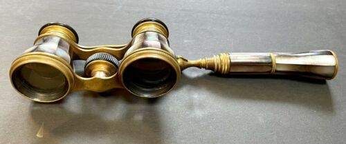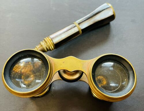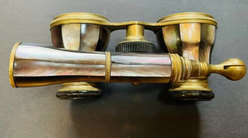Beautiful pair of mother of pearl telescoping opera glasses with handle, made by La Vouge Paris. These are really pretty with a dark purple/black hew to them. The handle comes apart, and internal metal rod comes out and can be screwed and reconfigured to telescope--does take a few attempts if you are not familiar with them. These would make a great statement piece to your collection. Lens dials to zoom turn smoothly. Measures: Handle fully extended with telescope 8.5" With Handle not extended 4.5" Binoculars are 4" across. Excellent estate found condition. Glasses do have an area on the handle where the mother of pearl has cracked but is still present. Small area on one of the monocle mother of pearl where it is cracked but still present. I did not see any areas of pearl loss. One of the side of the lens frame was dropped at some point in its history and has a very small area that is missing the frame and is white surface staining-- please see photos very minor imperfection but still present. There is some sticker residue on one of the monocles mother of pearl ares--could easily be removed by new owner I am selling as is. They are marked La Vouge Paris on lens frame. As a general disclaimer, all items are sold as is where is. They are vintage estate found and all items run the risk of having the following defects which are, but not limited to: age spots dark or light, scratches, paint loss, fading, signs of age, signs of use, signs of general wear and tear, signs of storage. These defects are assumed to be present in all items--but as stated above I try to describe all items in complete accuracy. Additionally, seller is not responsible for any color deviations-- each users computer/smart phone displays colors differently based on user preferences, these preferences may make colors appear brighter/darker/muted/lighter ect. Buyer accepts this upon purchase of item. If you require additional photos to double check colors please let me know, I am happy to provide any needed. If you have a question, are unsure, or require additional photos please do so prior to purchase, as I do not accept returns. I am happy to answer any questions, and provide additional photos as needed. In the rare occasion a return is accepted by this seller, buyer agrees to all return shipping charges and upon purchase of this item further agrees to a 35% restocking fee being deducted from their refund.