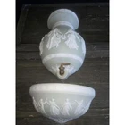 Elegant antique water dispenser and basin set featuring exquisite relief work depicting classical dancing figures in white against a soft sage background. Perfect for creating a sophisticated focal point in a powder room, garden room, or covered patio. The decorative wall-mounted design adds both functionality and artistic charm, ideal for entertaining spaces or creating an old-world European ambiance. Repair shown in photos on lid. Keywords: vintage water dispenser, ceramic wall fountain, neoclassical decor, wall mounted basin, grecian relief art, antique bathroom accessories, decorative water vessel, classical wall decor, vintage bathroom fixture, sage green ceramic