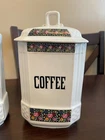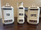 Good vintage condition. The coffee and tea jars are in very good shape. No cracks or issues with them. The vinegar jar is missing the stopper, and the rim has a large chip on the edge. There is also a faint cracking on the front. Please view photos for close ups of issues. Set is being sold as is, no refunds on these items. **Every item is examined thoroughly and description is to the best of ability. Unless grossly mis-represented, all items are sold in as is condition. All found defects will be noted in the listing and in photos to the best of my ability. Some items may have residual odors from closets, attics, etc. I will try my best to note any items that have an odor, but every persons sense of smell may be different. If you need additional size measurements, I will be happy to provide before purchase. Please ask any questions before bidding or purchasing, and ensure you are ok with my no return/refund policy. Will combine shipping. Thank you for viewing!