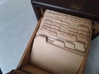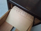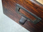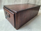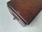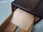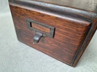 The Antique Oak MACEY File Drawer Index Card Cabinet is a stylish and functional piece of furniture that features an Antique Brass handle finish. It has one door with a pull handle, revealing a single shelf and drawers set. The cabinet is made of Oak with LOTS of DOVETAILING giving it a classic and elegant look. This MACEY piece from the early 1900s measures 14 inches in width, 7 inches in depth, and 5 inches in height, making it a compact and versatile storage solution. It also comes with original blank and written index cards for added authenticity. VERY GOOD PRE-OWNED CONDITION. SOLD AS IS. UPS SHIPPING