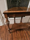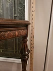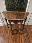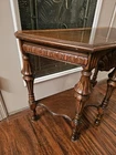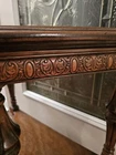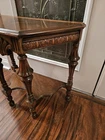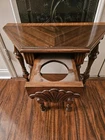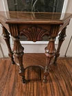 Stunning, ornate antique smoking table. A drawer pulls out of the front exposing an area for an ashtray. Overall good condition. Some minor flaws on top which are included in pictures. Might be small areas of finish wear here and there. I did not attempt to clean or polish this item. Pictures provided of each side and angle, so please refer to them for further description and condition. I'll be happy to provide additional photos of any area upon request before purchase.