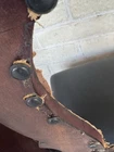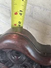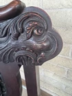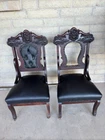Antique pair of Renaissance Revival chairs Beautiful carved faces on chairs Black leather seats and backs One needs leather repair Smoke free home Construction is solid Original front wheels Nice design Great patina