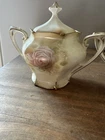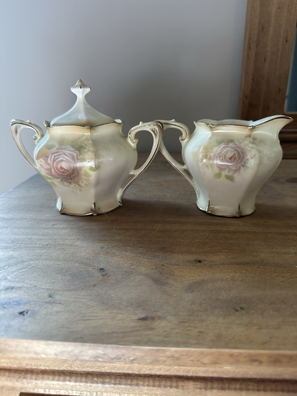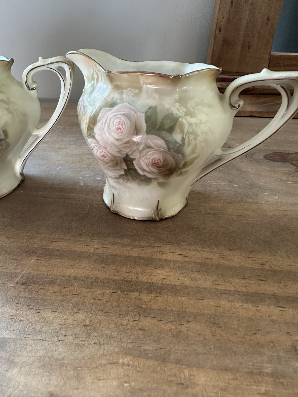 The Antique RS Prussia Hand Painted Pink Roses Creamer and Sugar set is a beautiful example of Art Nouveau style porcelain craftsmanship from the early 1900s. Hand painted with intricate floral patterns in a creamy white and pink color palette, this set exudes a vintage charm and elegance. Made in Prussia (now Germany), this original production set is a perfect addition to any collector's arsenal, showcasing the traditional pottery techniques and glossy finish of the era. Ideal for serving cream and sugar, this set is sure to be a conversation starter at any dining table. No chips or cracks