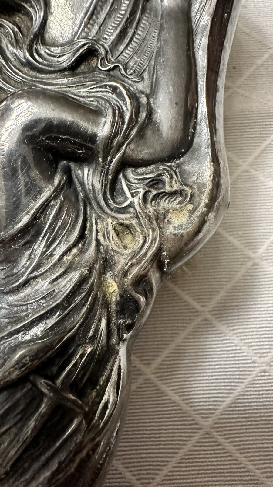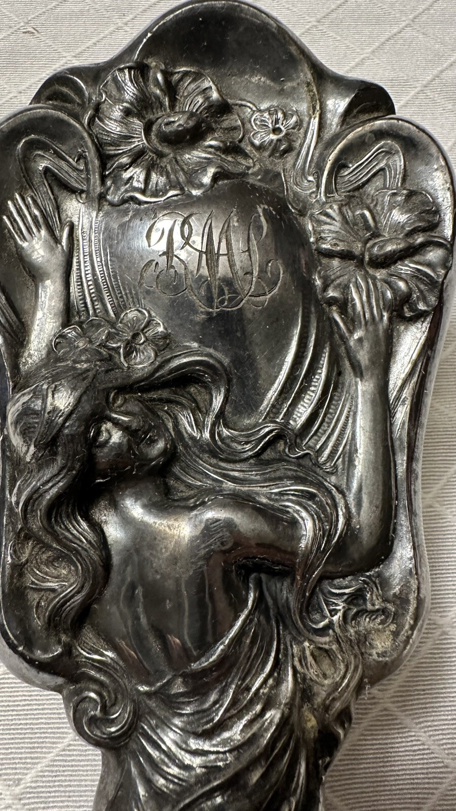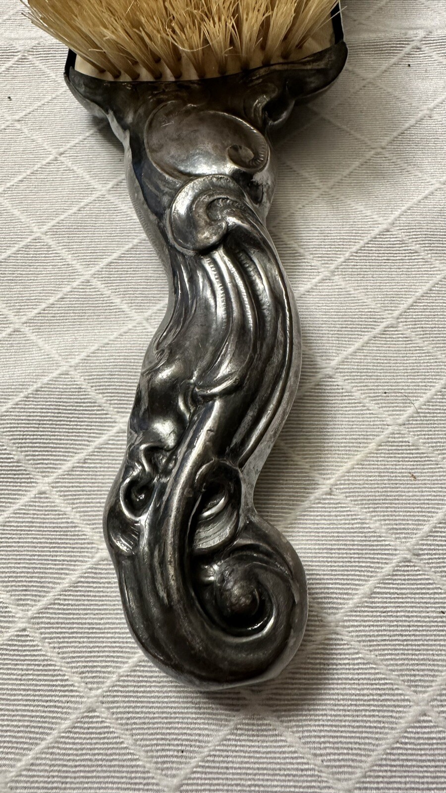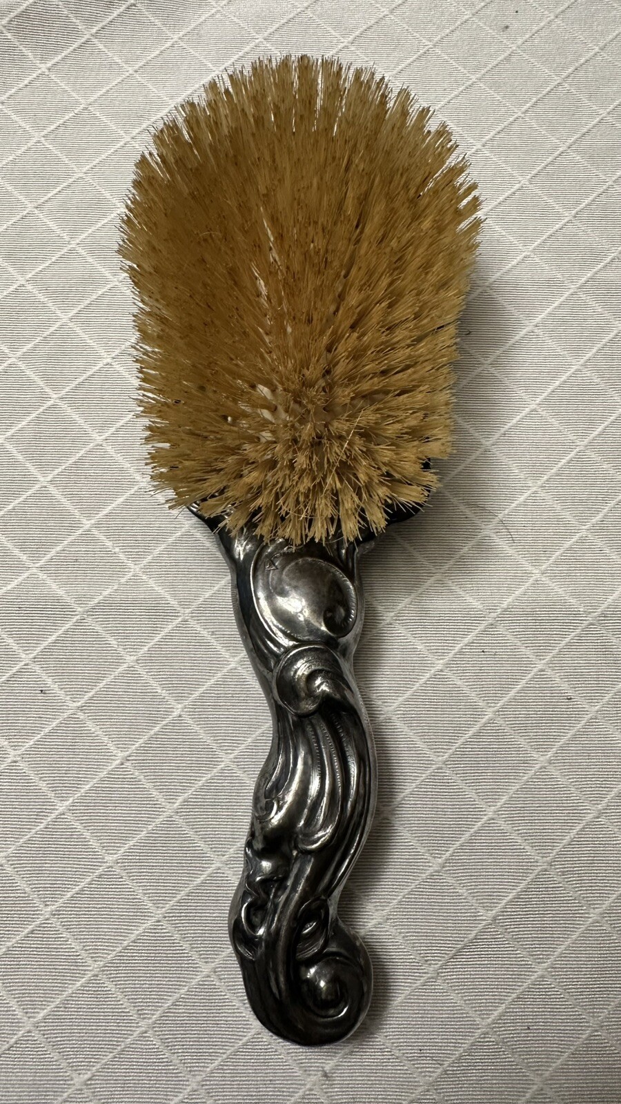 This antique hair brush features a rare Art Nouveau design with artistic silver detailing. The intricate craftsmanship of the brush reflects the elegance and sophistication of the Art Nouveau era. A unique and collectible item, this brush would make a stylish addition to any vanity or grooming collection. It is a single unit quantity and is not handmade.