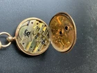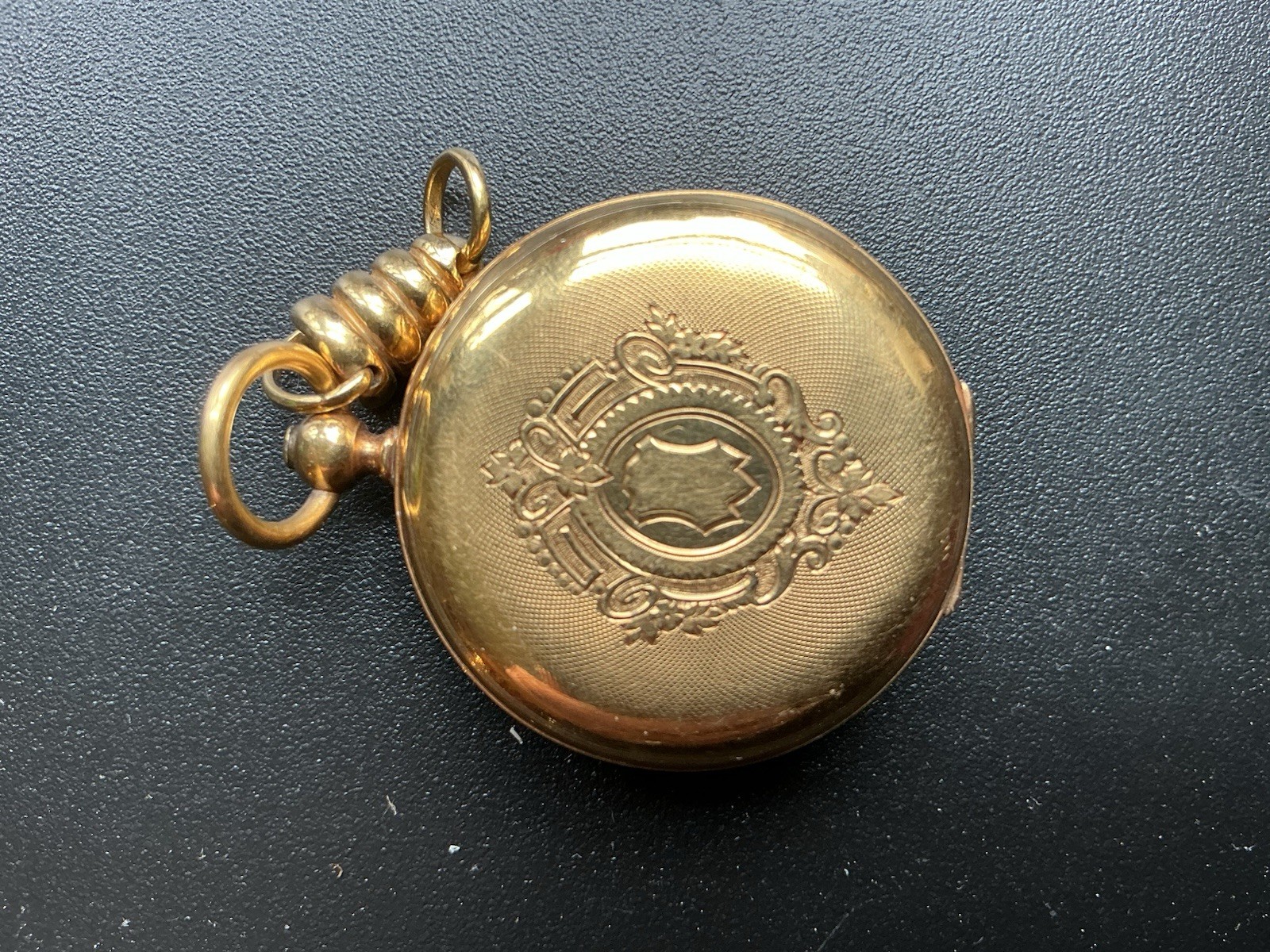 18 kt gold round outter open face 32.5mm case with round white dial gold toned base metal inner case cover, black Roman numeral hour makers with gold toned hands, manual keyed wound jeweled movement. Stamped on case cover ED hallmarks 27431 2840, stamped on inner case cover Cylindre Huit Rubis 2840, circa mid 1800s, condition good.