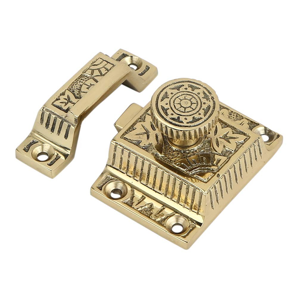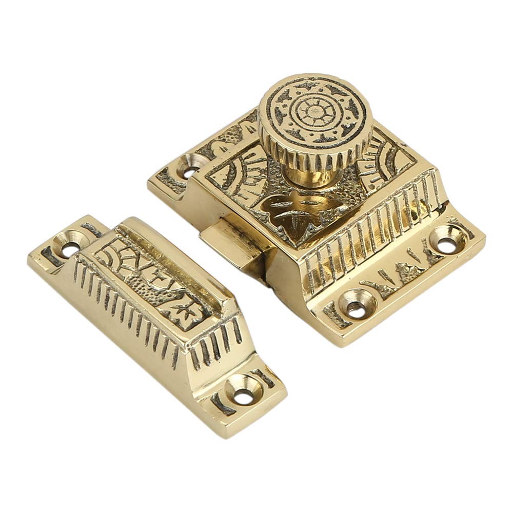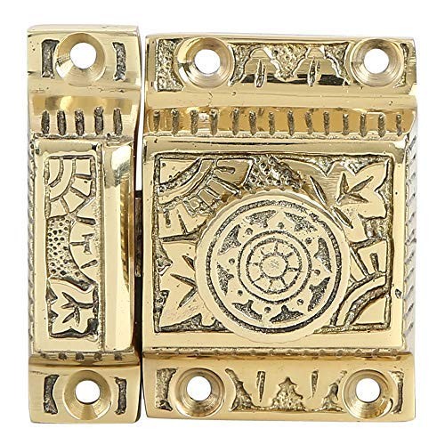 This is a high quality, brass construction cabinet and cupboard latch with a round knob. The fencing and flowers which are common to the Windsor design makes it an ideal antique reproduction piece. Each cabinet latch is handcrafted with a manual application of antique brass finish, so some variations in color and size should be expected. But, this makes these cabinet latches unique and distinctive from each other which adds to the traditional décor of your kitchen or home. UNIQUE DESIGN : This beautifully carved cabinet latch features a Windsor Design with Polished Lacquered Brass Finish which makes is an ideal piece for the traditional setup of your home or kitchen decor. POLISHED LACQUERED FINISHING : Latch is made from Brass, which lends it a sturdy construction. The latches are handcrafted so some variations in the size, boring, and shape should be expected. However, all efforts are made by the craftsman to keep the pieces as consistent as possible. Having said that, this makes each piece unique from others which gives an authentic and distinctive appeal to any cabinet. Faceplate Dimensions of the Latch: 1-1/2" L x 1-1/4" W x 2-1/4" H; Catch plate Dimensions: 3/4" L x 3/4" W (front to back) 2-1/4" H. EASY DIY INSTALLATION: Extremely easy self installation is possible for these cabinate latches as each package includes mounting hardware such as screws. 1 latch per pack. MULTIPLE USE: This latch can be used for your cabinet, cupboard, file cabinet and other furniture to give them a secure closure. You can use this latch for your bedroom, kitchen, bathroom, outdoor and pet door giving an antique and royal feel to your surrouondings.