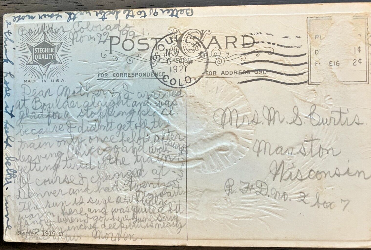 Antique postcard: Thanksgiving Greetings with a turkey posed in a wreath of hay wrapped in gold ribbon and a bow. Posted