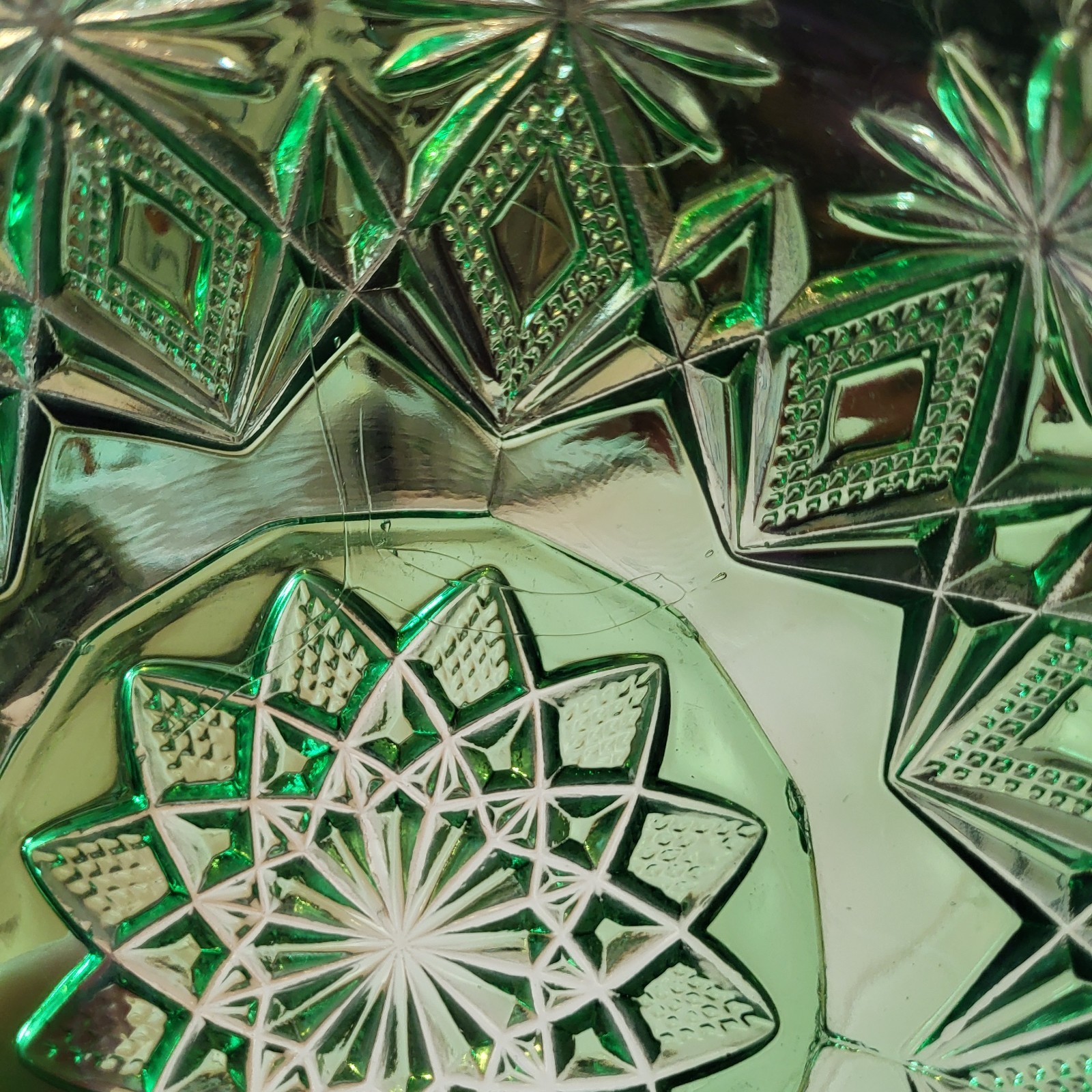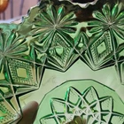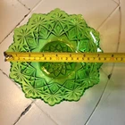 This rare antique US Glass Co. green bowl features a unique Blazing Pinwheels pattern, typical of the Victorian era. With a round shape and pressed glass production style, this vintage piece stands at 7.5 inches in diameter and 2.25 inches in height. Made in the United States during the early 1850 - 1914 this rare find showcases intricate pinwheel designs that are sure to add a touch of historical charm to any collection. Please see imperfections and small clamp shell chip.
