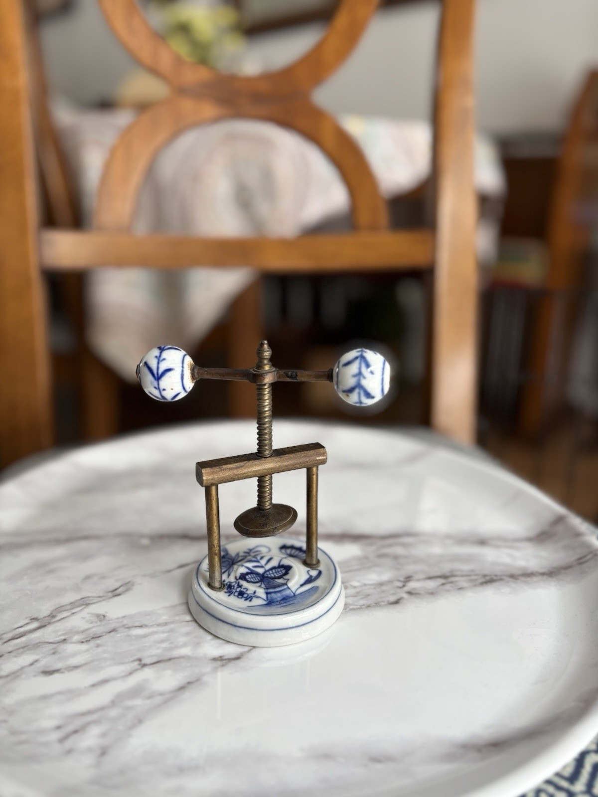 This Antique Victorian Nut Cracker from the 1800s is a unique and charming collectible item and still functions. Made of porcelain and metal, this blue and white nutcracker measures 5 inches in height. With its Victorian style and original design, this piece is sure to add a touch of vintage elegance to any decor. This nutcracker is a special find for collectors of rare and historic items.