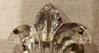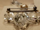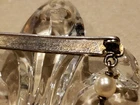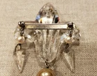 ANTIQUE VICTORIAN 6" BROOCH/PIN, FLEUR DE LIS PRESSED GLASS W/FAUX PEARLS. SIMPLY BEAUTIFUL PIECE, BIG & BOLD. PRESSED GLASS CRYSTALFLEUR DE LIS W/2 HANGING PIECES ON SIDES & LARGE FACETED CRYSTAL DROP, ACCENTED W/FAUX PEARLS & ROUGH DARKER LARGER FAUX PEARL. NOT SURE IF PIN BACK IS STERLING OR JUST SILVERTONE METAL. ALL SODERED..NICELY MADE & IN VERY GOOD CONDITION. NO CHIPS..