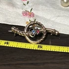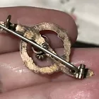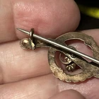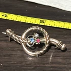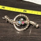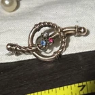 This Antique Victorian Brooch features blue and red stones, along with seed pearl set in rose gold filled metal. The brooch has a classic design typical of the Victorian era, with intricate details and a touch of elegance. It is a vintage piece that exudes charm and sophistication, making it a perfect accessory for those who appreciate antique jewelry with a touch of history and style. C clasp