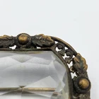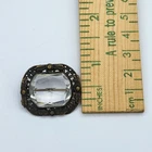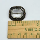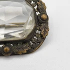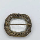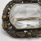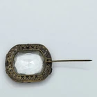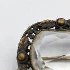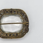 This Antique Victorian Brooch is a vintage piece featuring a clear rhinestone in a step cut octagon shape set in brass. The rectangular brooch has a timeless design that can be worn on various occasions such as Mother's Day, weddings, graduations, or birthdays. This original Victorian era jewelry piece is signed by the brand Antique and adds a touch of elegance with its white/colorless rhinestone and intricate brass detailing.