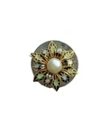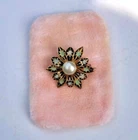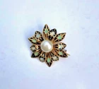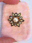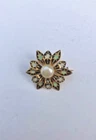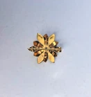 Antique Victorian Brooch Pin Black Enamel Moravian Stars Pearl Flower shaped enamel over a t most 3k bright yellow gold Black enamel petals with alternating pastel green and pale pink tiny Moravian stars Center pearl Measures 7/8" - last photo shows pin on top of a quarter for size reference Very Good condition as shown in photos Read my feedback - buyers have been very happy with my auctions!