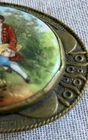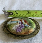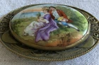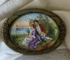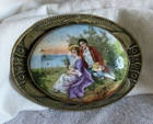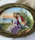 Estate find brooch with loving young couple. Measures 2 1/2” long. Pin back does not have latch. Some age spots and slight bumps on artwork.
