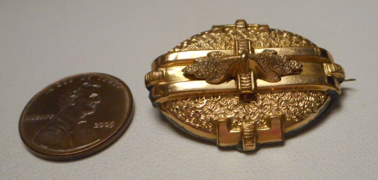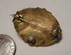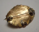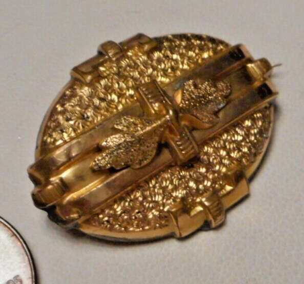Antique Victorian circa 1880s small gold-filled brooch, oval shape, with stippling, quasi buckle motifs, and leaves at the center, measuring 7/8" x 1-1/4" overall, unmarked, condition: the front is in good antique condition, the back shows some repair work, sold as found, previously owned, from a local estate. Email with questions. Visit our eBay Store for our current 7-day auctions and "Buy it Now" listings with the "Make an Offer" feature. Bidders, please read the following "fine print": Payment is expected within 3 days and eBay now allows sellers to cancel sales after the 4th day of non-payment. When we have to cancel a sale because of non-payment, we will also block the bidder from future bidding with us. We sell estate items on consignment, so we cannot afford to offer free shipping. Shipping reflects the actual cost of shipping plus handling fees. Please do not ask us to reduce the shipping fees, however we will manually combine multiple items for a reduced domestic shipping fee if possible. We reserve the right to revise the shipping to charge more for large or heavy items when the destination state is west of the Mississippi such as California, also Florida & Texas, Alaska & Hawaii. INTERNATIONAL BUYERS: WE ONLY SHIP VIA EBAY'S INTERNATIONAL SHIPPING PROGRAM. WE CANNOT COMBINE MULTIPLE ITEMS FOR INTERNATIONAL SHIPPING. WE DO NOT SHIP DIRECTLY TO INTERNATIONAL CUSTOMERS. Our physical brick & mortar gallery located in Royal Oak, Michigan for over 33 years, is closed on Sundays & Mondays. Any payments received for orders on those days will be processed on the following Tuesday afternoon. Our regular brick and mortar store hours are Tuesday through Saturday from 12 noon to 6pm. We pack and ship paid eBay items on Tuesday, Thursday & Saturday afternoons. Thank you kindly!