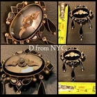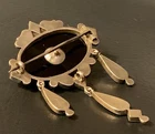 Antique Victorian 10K Gold Filled C-Clasp Black Onyx Seed Pearl Dangle Mourning Brooch Pendant. This antique 1890’s Victorian c-clasp mourning brooch pendant is comprised of an oval shaped black onyx cabochon surrounded by smaller cuts and dangled drops of onyx in a 10K gold filled setting. The center stone is accented with a seed pearl nestled by a textured gold filled ribbon flourish. Unfortunately, the onyx center stone is damaged. Beside minor scratches and normal wear, it does have pitting and several fissure lines. The cracks go through to the back of the stone. However, as the pics and video illustrates, the onyx cabochon is very much firmly and securely set in place and ready to last another 100 years! IMPORTANT: Please VIEW ALL PHOTOS in this Listing CAREFULLY and WATCH VIDEO to Assess Imperfections and Ensure You’re OK With Existing Condition BEFORE Purchasing (I Took Photos from Multiple Angles in Various Lighting to Give Clearest Representation of Item and Condition). Price Reflects Damage! As This is an Antique Piece, It Is Being SOLD AS-IS. If you have any questions, please feel free to reach out to me. Thanks in advance! Antique Victorian 10K Gold Filled Black Onyx Seed Pearl Dangle 1890’s Mourning Brooch Pendant Video will open in a new window Using the mobile app? Copy this link into your browser: Antique Victorian 10K Gold Filled Black Onyx Seed Pearl Dangle 1890’s Mourning Brooch Pendant Video will open in a new window Using the mobile app? Copy this link into your browser: