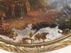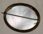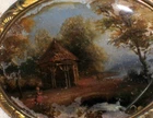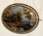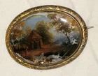 Reverse Painted Brooch with Miniature Country Scene- Circa 1840 Finely painted brooch, dating from about 1830 - 1850. Although my aunt acquired this in London many years ago, the history suggests that it is French. The miniature scene is painted on the reverse of glass - the brush strokes are tiny, but visible under magnification. We see an idealized country scene with a rustic gazebo and arched stone bridge over a little steam. There are two figures: a girl in a bonnet and pink dress, and a man in the distance near a lake. The brooch is 2" x 1 1/2", with a gilded metal frame and c-clasp. As you can see, the paint has separated from the glass at the edges, as is common in these antique hand painted pieces. All parts of the brooch appear to be original. Due the delicacy of the painting, it is more suited for display than wearing - think of it as a tiny piece of art.