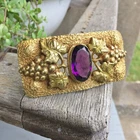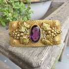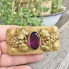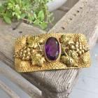 Antique Victorian Sash Brooch Pin Grape Motif Purple Faceted Gemstone Gold 3" This is an antique Victorian sash pin the measures 3" x 1 1/2" and features a purple gem. The gemstone is oval shaped and faceted and is bezel set. There are grape clusters on each side of the gem. This gilt gold pin is not marked by a maker. It has the older "c" closure for the pin stem. The gem is lively and no chips or cracks. My photos are of the actual item you are getting. See our store for other interesting vintage and handcrafted jewelry. PAYMENT DETAILS: Buyer must furnish seller with "ship to " address that matches the address registered on ebay. Payment is expected within 3 days after close of auction. SHIPPING DETAILS: If package is less than 13oz it will be sent First Class. If package is over 13oz to 5 lbs it will be sent Priority Mail. If package is over 5 lbs it will be sent Priority Mail or Retail Ground. Book packages less than 5oz will be sent First Class. Book packages over 5oz will be sent Media Mail. We usually ship within 24 hours of payment (weekend & holidays excluded). Please contact us if you prefer another method of shipping. We are happy to combine multiple items to save shipping costs (if items can be put together). RETURNS: Buy with confidence. We provide a money back guarantee if you are not satisfied (minus shipping cost). Prompt return of item insures prompt refund. Items must be sent back within 5 days after return request. Returns must be shipped by an insured carrier. INTERNATIONAL BUYERS: You may qualify for a cheaper rate. We accept only PayPal. If you need more details contact us. Thank you for looking.