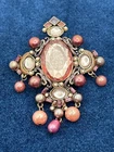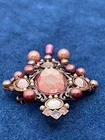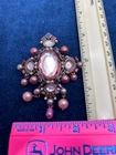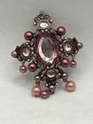 This antique brooch showcases a Victorian style with intricate detailing. The piece features captivating pink gemstones and pearls, adding elegance to any collection. Its craftsmanship reflects a bygone era, making it a valuable addition to vintage jewelry enthusiasts. • Victorian style • Pink gemstones • Pearl adornments • Intricate detailing • Antique finish • Metal alloy base Top to bottom = 3 inches