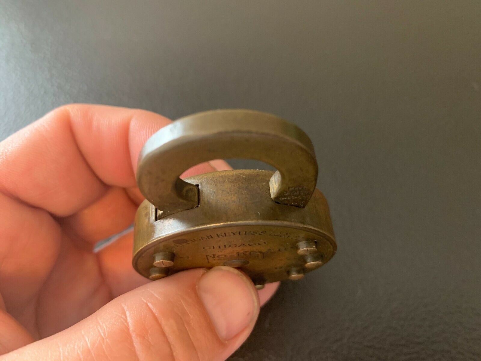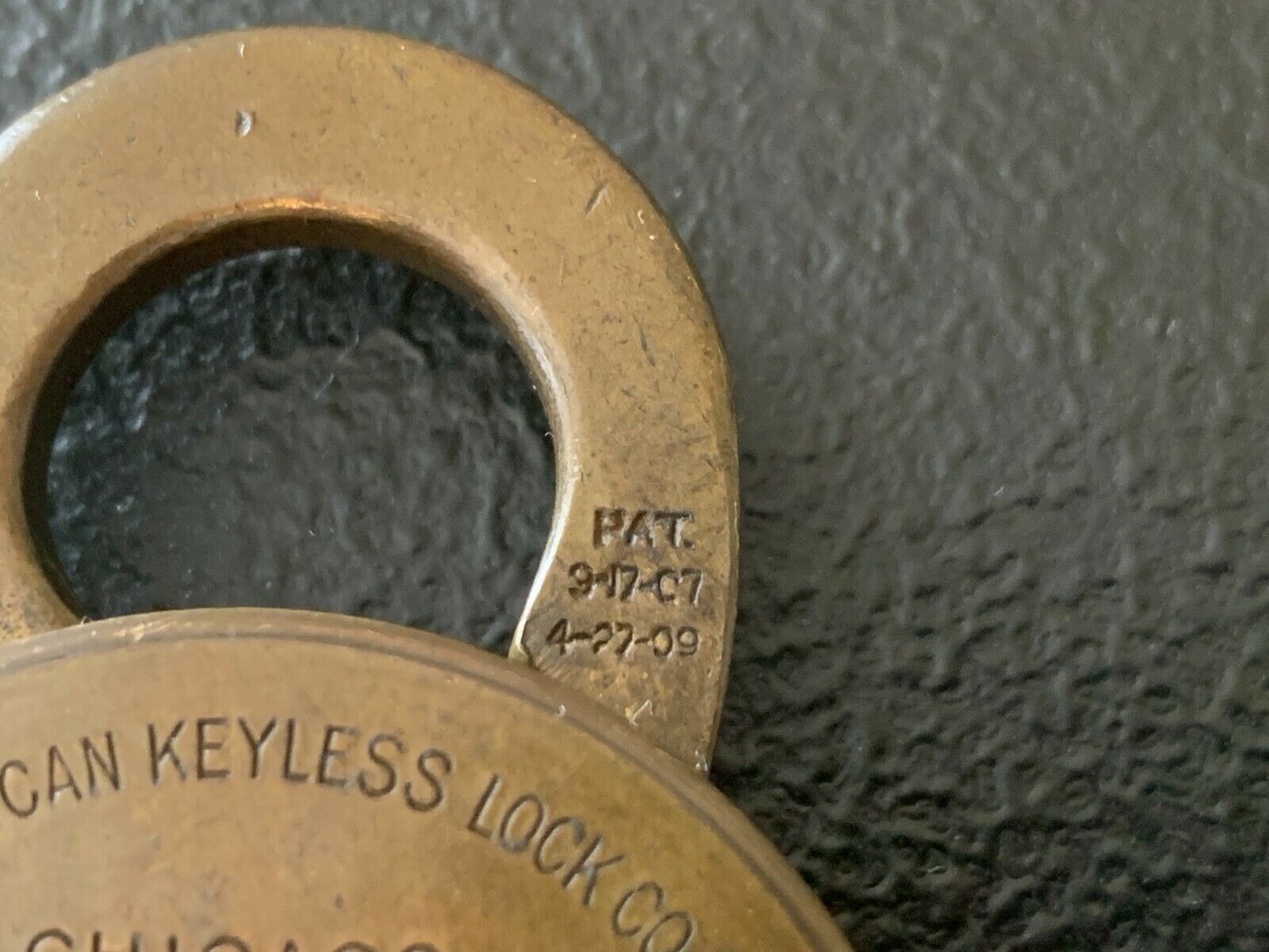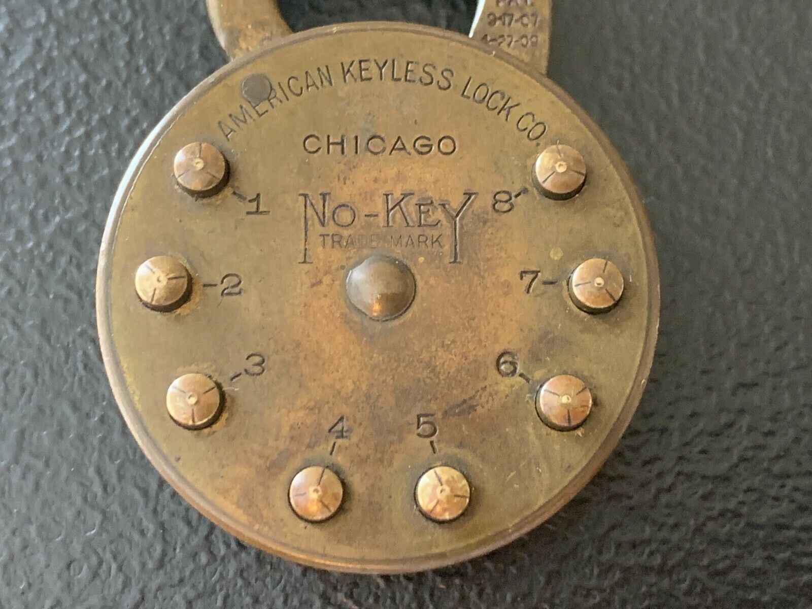 Up for auction today is an estate fresh Antique Vintage NO-KEY AMERICAN KEYLESS LOCK CO. CHICAGO PAT. 1909 Brass Combination Lock Padlock. The lock measures 2 3/4 inches tall and 1 7/8 inches across. The lock is locked and I do not have the combination but it does have good bounce to it and in nice condition. Please Enlarge each photo and zoom in for a closer look and judge for yourself the condition ! (PLEASE CHECK MY OTHER AUCTIONS AS WELL, I AM LISTING OVER 50 HARDWARE AUCTIONS TODAY INCLUDING LOCKS, KEYS, SIGNS/PLAQUES, POST OFFICE BOX DOORS, ETC. INDIVIDUALLY AND I WILL COMBINE SHIPPING FOR CHEAPEST PRICES. THE LAST PICTURE IN THIS AUCTION IS A GROUP PHOTOGRAPH OF SOME OF THE ITEMS I AM LISTING TODAY, EACH ITEM IS SOLD SEPARATELY AS INDIVIDUAL AUCTIONS.) Please Enlarge each photo and zoom in for a closer look and judge for yourself the condition . You are guaranteed to get the exact item pictured in this auction. Cool Piece! All items are sold "as is." ( Please Enlarge each photo and zoom in for a closer look and judge for yourself the condition ) Guaranteed 100% old and authentic! NO RESERVE. Please ask all questions before you bid. Because all items are found from estates, they are sold "as is." Buyer to pay shipping and handling fees. I have never had any problems with breakage and pack very carefully. Thank you for bidding and GOOD LUCK!!
