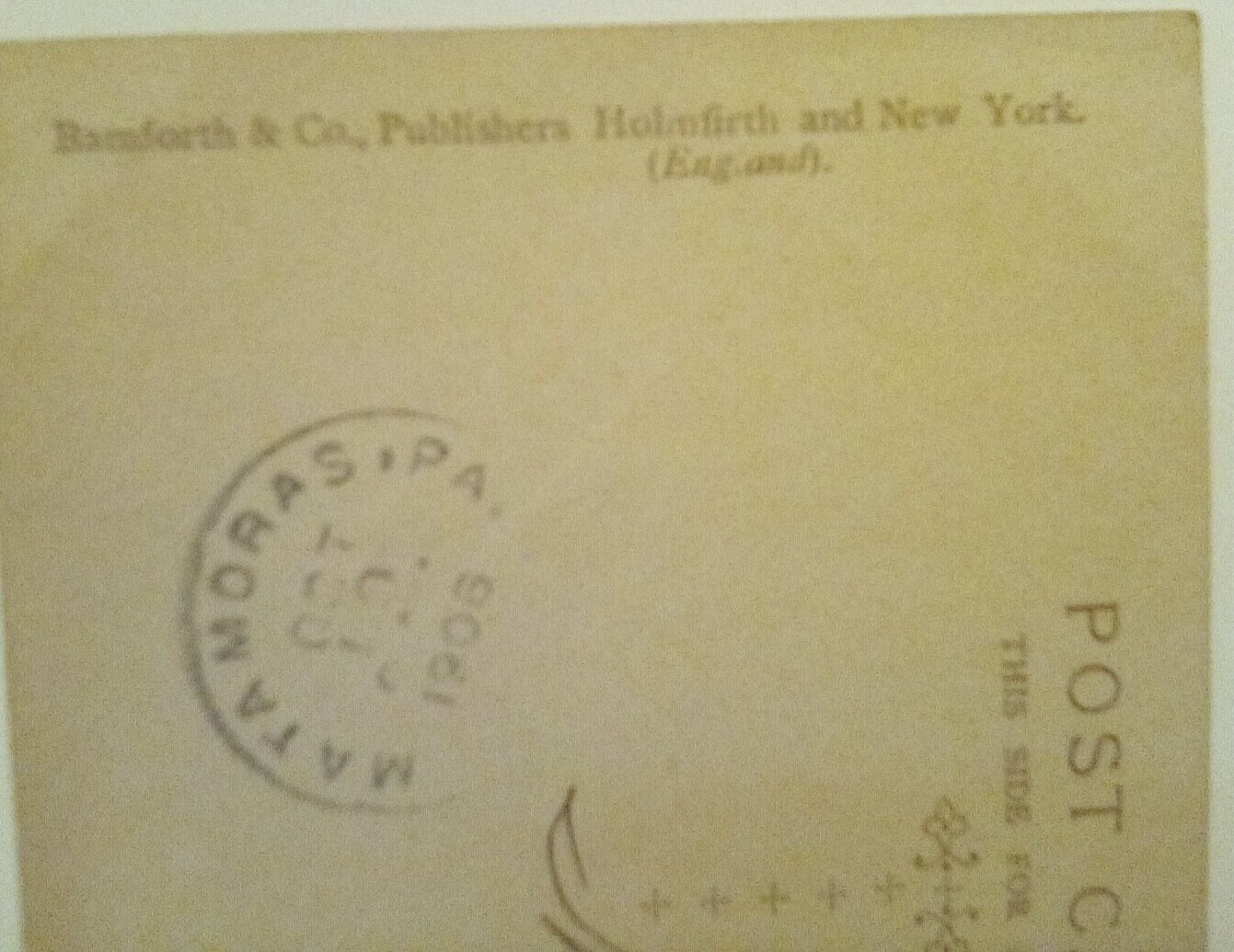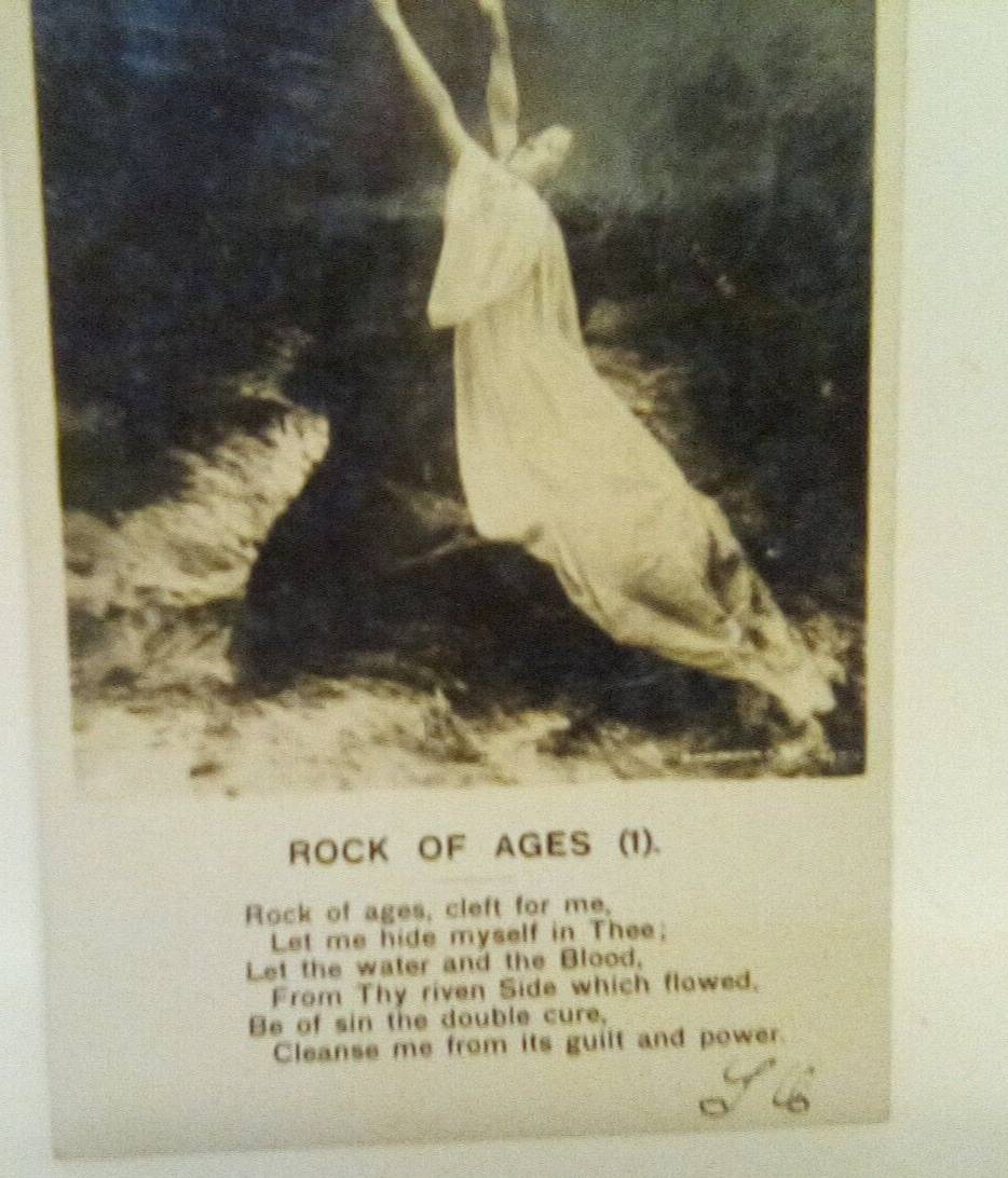 The product is an antique postcard with the title "Rock of ages (1) posted 1906." This original real photo postcard was manufactured in 1906 by Bambforth Publisher in New York. The postcard depicts a subject related to Christianity and was posted in the United States during the Undivided Back era. Measuring a standard size of 5.5 x 3.5 inches, this collectible postcard offers a glimpse into the history and culture of the time period.