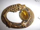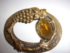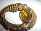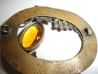 This antique Victorian sash brooch is a stunning piece of jewelry that will surely catch anyone's attention. The brooch features a beautiful oval-shaped amber glass that glows a warm yellow color. The copper and brass metal that surrounds the brooch adds to its antique charm. Perfect for formal occasions or for adding a touch of elegance to any outfit, this brooch is a must-have for any jewelry collection. Its unique design and timeless beauty make it a great gift for someone special or a treat for yourself. Missing back pin as is measures 2 3/4" by 2 1/4"