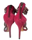 Elevate your style with these stunning Antonio Melani heels featuring a multicolor pattern, open toe, and a stiletto heel style. The zipper closure adds convenience while the suede lining and breathable features keep you comfortable all day long. Perfect for all occasions including travel, wedding, party, cocktail, and even workwear, these heels are a must-have in your shoe collection. Accessorized with rhinestones, sequins, and a suede outsole, these designer heels are perfect for formal events, clubwear, birthdays, Christmas, Valentine's Day, and even gambling. Available in size six and in a beautiful maroon color, these heels are lightweight and suitable for all seasons including winter, summer, fall, and spring. Invest in this gorgeous Antonio Melani model, and add a touch of elegance to your wardrobe. On Feb-10-25 at 21:34:04 PST, seller added the following information: Antonio Melani stilettos, maroon color. Man made leather maroon colored accent with multicolored rhinestones all over. Size 6, zips in the back, has leather soles. Heels are in very good condition and are not missing any rhinestones or beading.